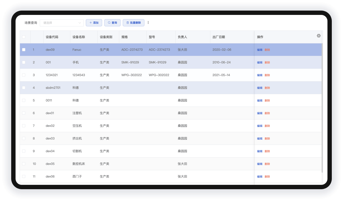 包含设备登记、启用、停用、规格型号、负责人等全生命周期履历管理记录